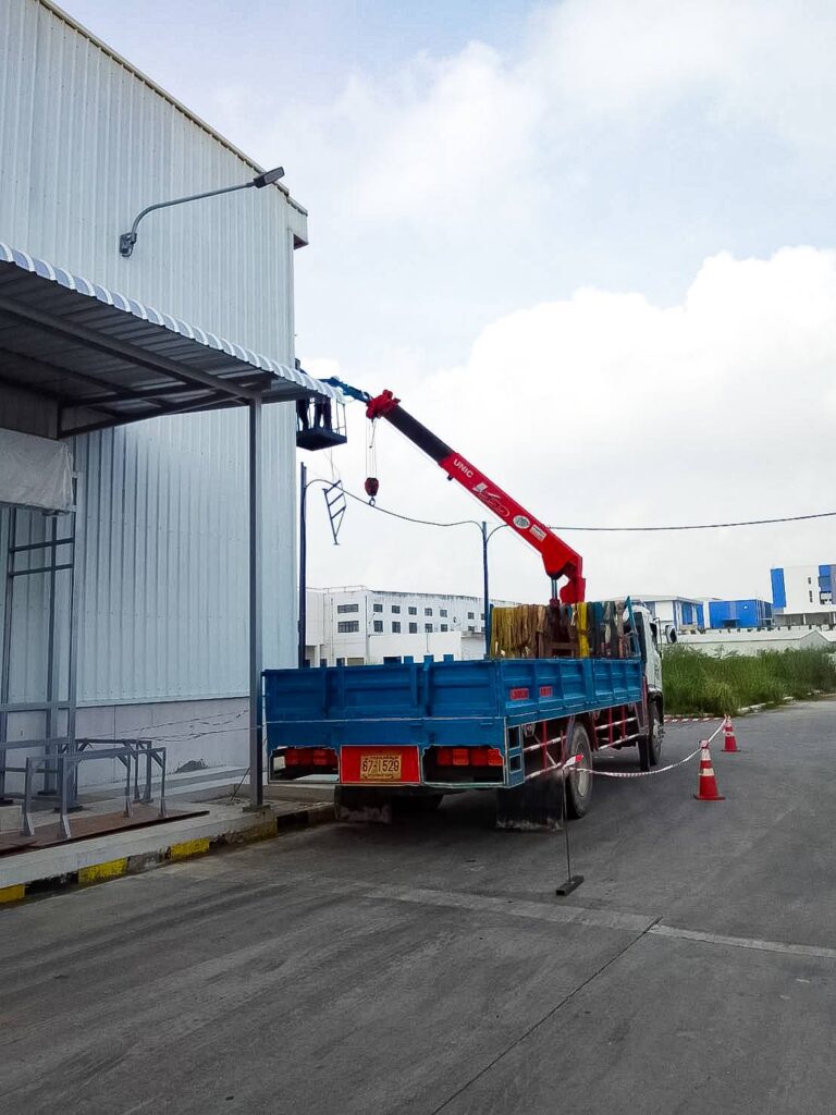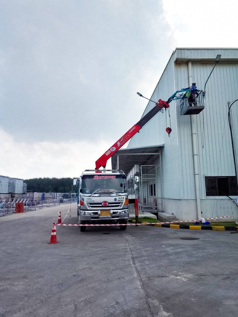 งานนี้เป็นการติดตั้งแผง โซล่าเซลล์เพื่อเพิ่มเเสงสว่างรอบตัวอาคารโรงงาน ตามจุดต่างๆ เพื่อเพิ่มประสิทธิภาพด้านพลังงาน ลดค่าใช้จ่ายไฟฟ้า ทีมงานต้องเข้าถึงพื้นที่ต่างระดับ รวมถึงบริเวณที่มีข้อจำกัดเรื่องความสูง ทำให้การใช้รถเฮี๊ยบติดกระเช้ากลายเป็นตัวเลือกที่เหมาะสมที่สุดในการติดตั้งระบบโซล่าเซลล์รอบพื้นที่อาคารโรงงาน หนึ่งในอุปกรณ์สำคัญที่ช่วยให้การทำงานบนที่สูงเป็นไปอย่างรวดเร็ว ปลอดภัย และมีประสิทธิภาพ คือ รถเฮี๊ยบ 6 ล้อติดกระเช้า ซึ่งถูกนำมาใช้เพื่อยกทีมช่างขึ้นทำงานบนระดับความสูงที่ต้องการ พร้อมรองรับอุปกรณ์การติดตั้งได้เป็นอย่างดี