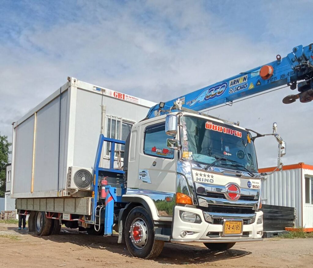 พร้อมรถเฮี๊ยบขนาดใหญ่สำหรับยกตู้คอนเทนเนอร์ทุกประเภท ทั้งตู้สำนักงาน ตู้เก็บของ และตู้สินค้าขนาดมาตรฐาน